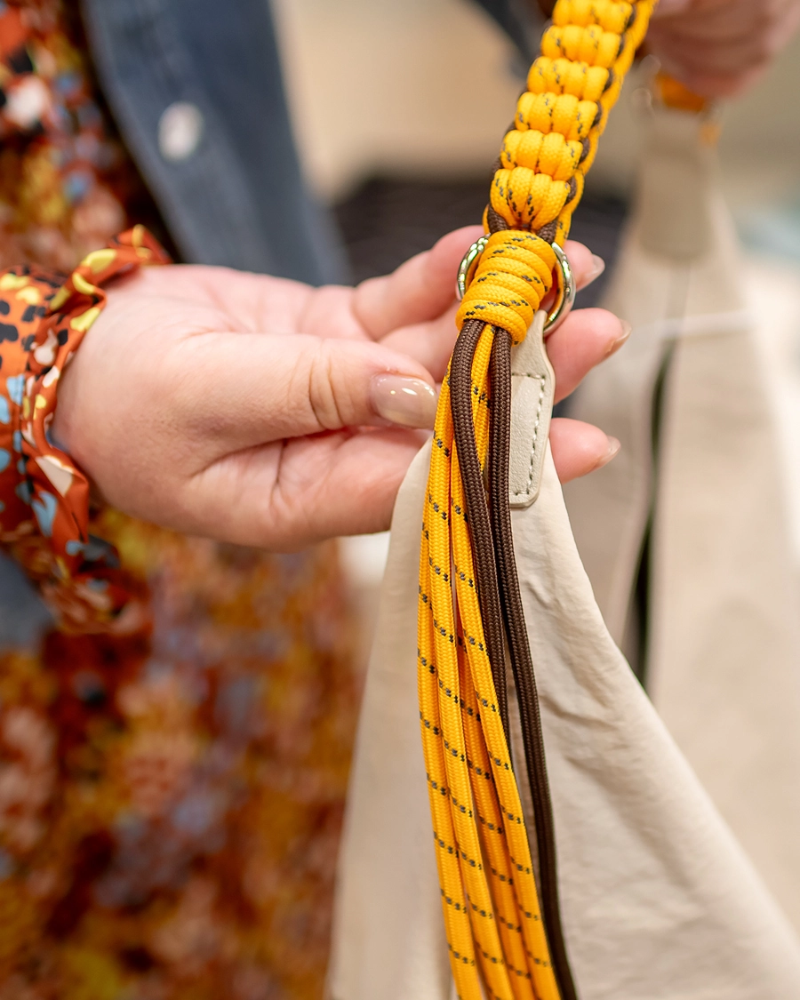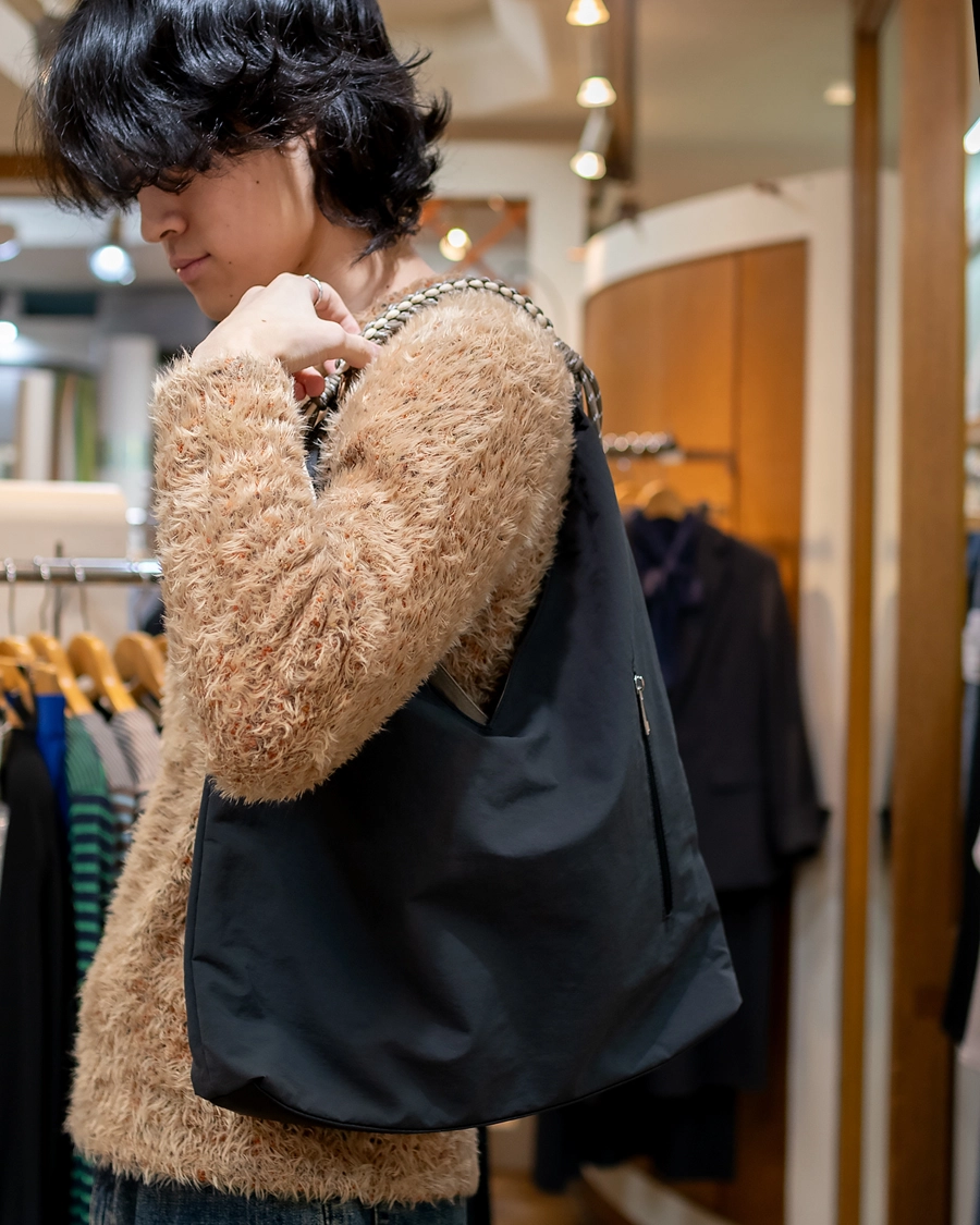 日本に昔からあるあづま袋にポリエステルを使用したバッグ。カラフルなパラコードで編まれた取手で肩がけしやすいバッグです。